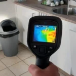 – La caméra thermique celle-ci est un appareil qui reproduit la forme d’un corps à partir de la chaleur qu’il dégage. Elle fonctionne dans le rayonnement infrarouge (IR) et capte les différences de température. Elle permet de visualiser les zones plus ou moins chaudes d’une construction ou d’un équipement. Elle est utile pour vérifier l’isolation, le chauffage, ou défauts électriques. De plus , la caméra thermique indique facilement si l’eau provient du haut du mur et donc peut-être du toit ou de la pièce du dessus (salle de bain, voisin, …)